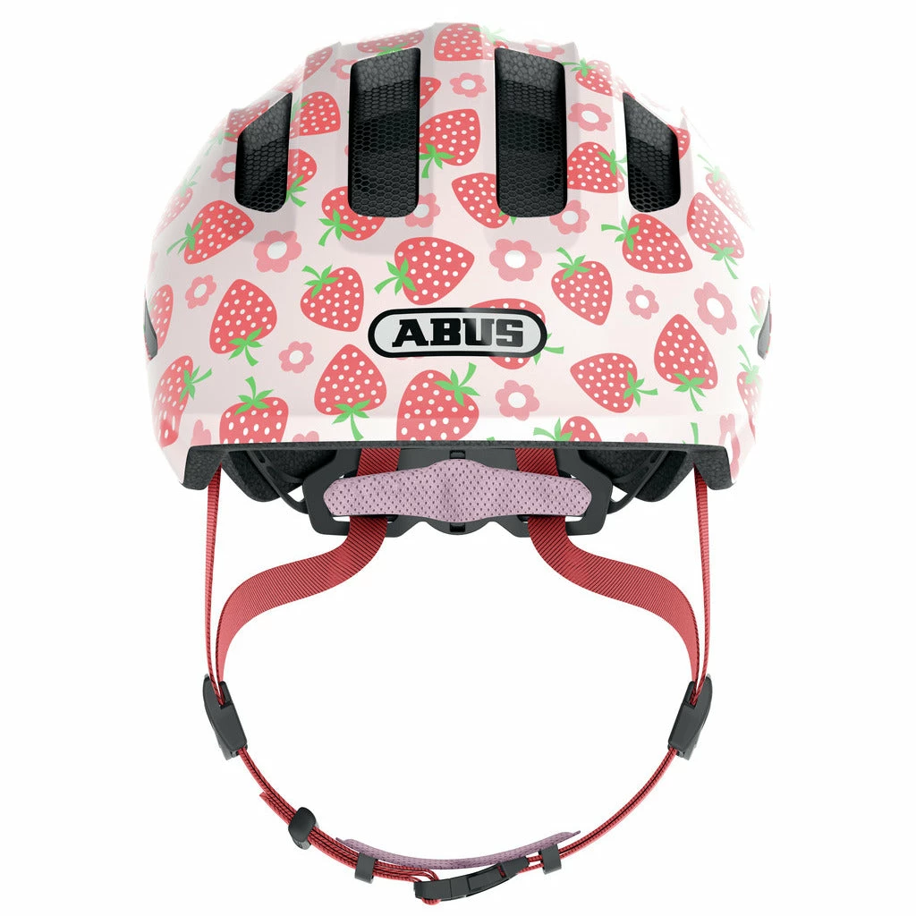 - Le casque Abus Smiley 3.0 LED Rose Strawberry Shiny : casque vélo rose avec motifs de fraises