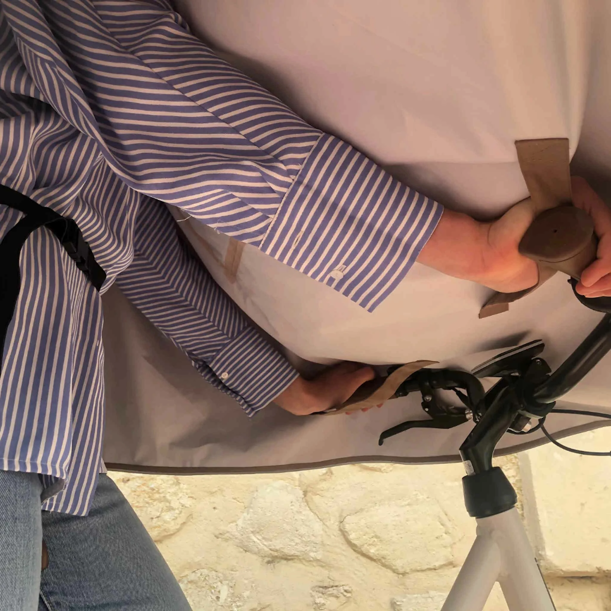 La cape de pluie Le Temps des Grenouilles peut aussi bien ĂȘtre utilisĂ©e pour vos balades Ă pieds que comme cape de pluie pour le vĂ©lo. Le poncho reste fixement attachĂ© grĂące aux fixations incorporĂ©es au niveau des mains Ă l’intĂ©rieur de la cape. Ainsi, vous posez les mains sur le guidons en tenant dans vos mains ces sangles. Une autre sangle de maintien fait le tour de votre taille afin d’avoir un meilleur maintien dorsal. Ces sangles vous permettent de rester au sec lorsque vous pĂ©dalez et empĂȘchent au poncho de s’envoler en fonction du vent.