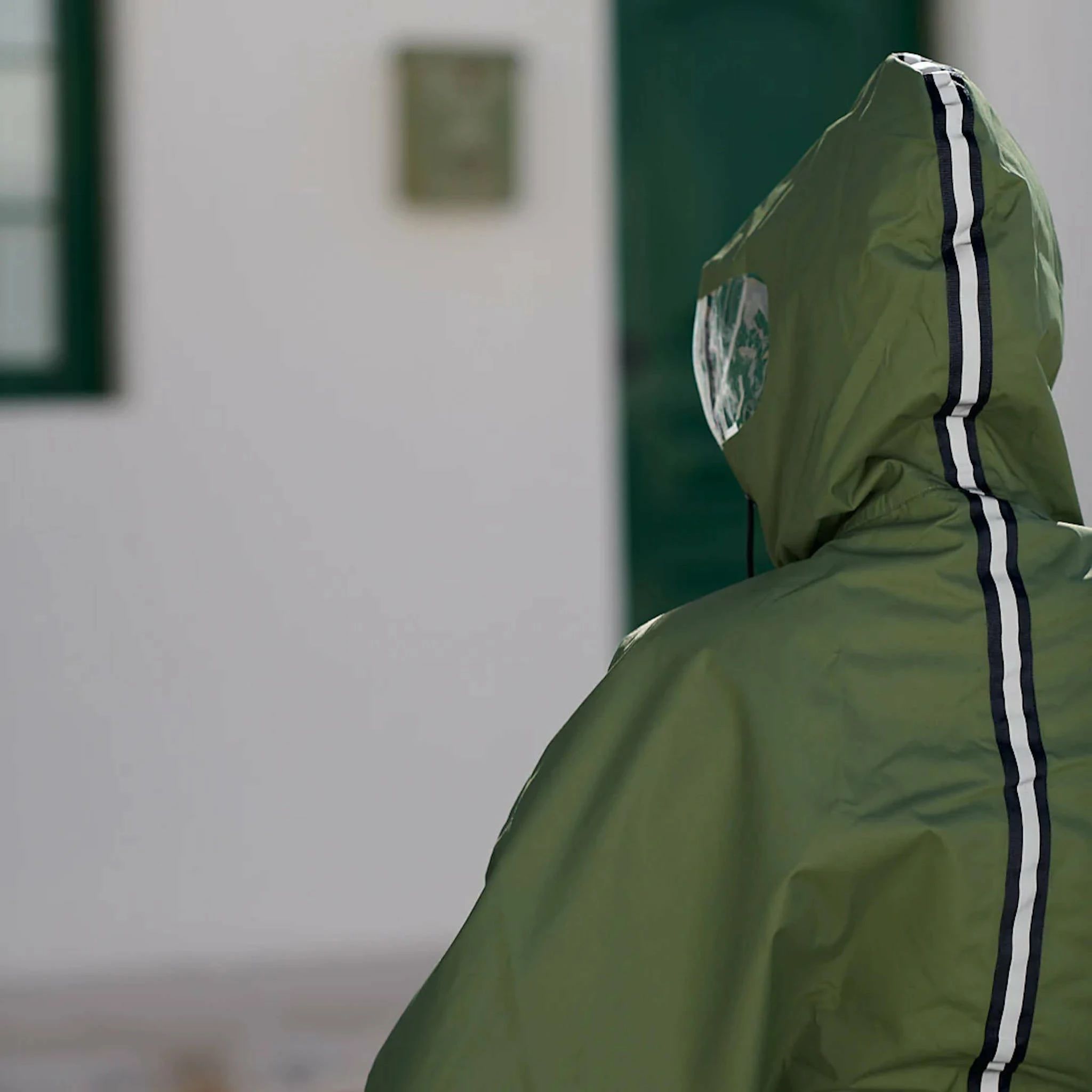 Des Ă©lĂ©ments rĂ©flĂ©chissants sont disposĂ©s sur le poncho afin d’avoir une meilleure visibilitĂ© sur la route, notamment une longue bande Ă l’arriĂšre qui va du bas du vĂȘtement jusqu’Ă l’avant de la capuche. IdĂ©al pour un usage urbain avec beaucoup de trafic.